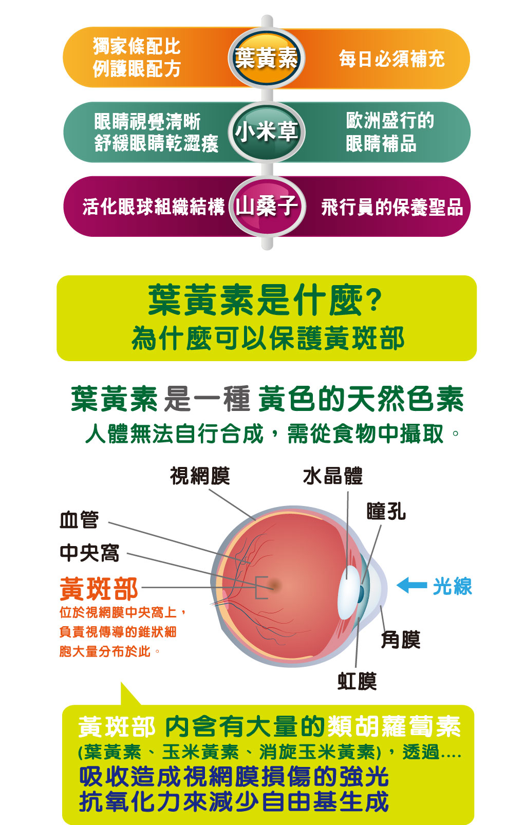 成 分:桑椹濃縮汁、小米草萃取、黑大豆穀萃取、枸杞子萃取、金盞草萃取(含葉黃素10%)、金盞草萃取(含玉米黃素5%)、B-胡蘿蔔素、維生素B2、維生素B12